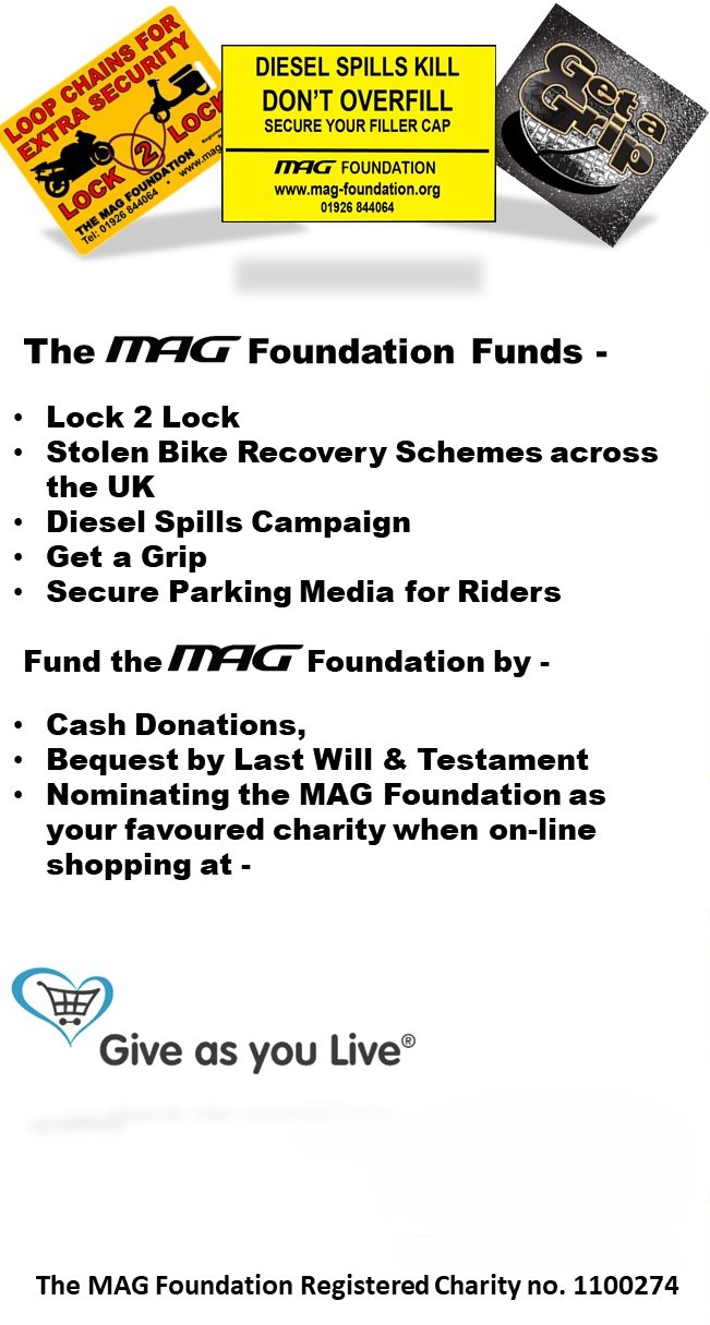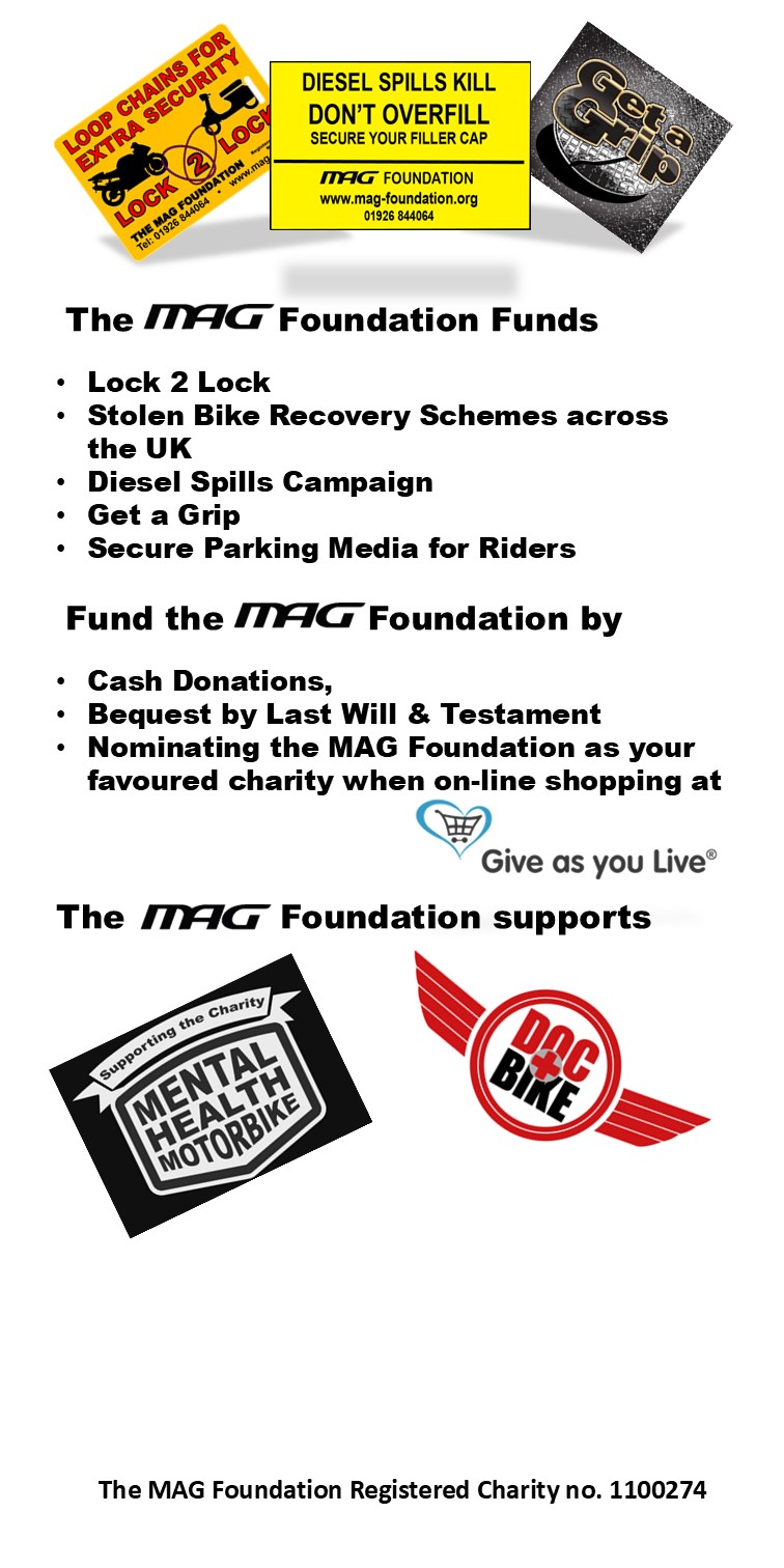 The MAG Foundation is a registered charity set up to support initiatives into motorcycle and scooter safety and security matters.